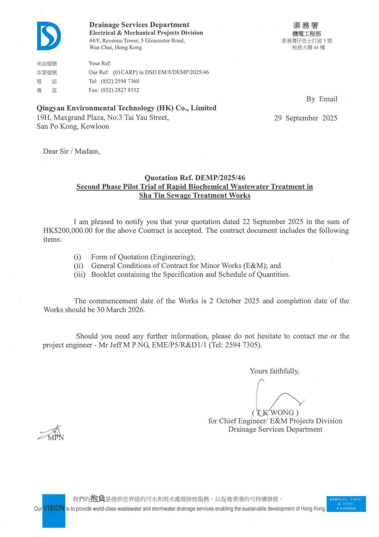 基于第一期中试的良好数据结果,香港渠务署(以下简称DSD)决定再次资助公司开展第二期中试项目,且此次资助金额为20万港元,较一期资助金额翻倍(一期中试获得DSD10万港元研发资助),充分体现了DSD对清研环境RPIR技术的高度认可。